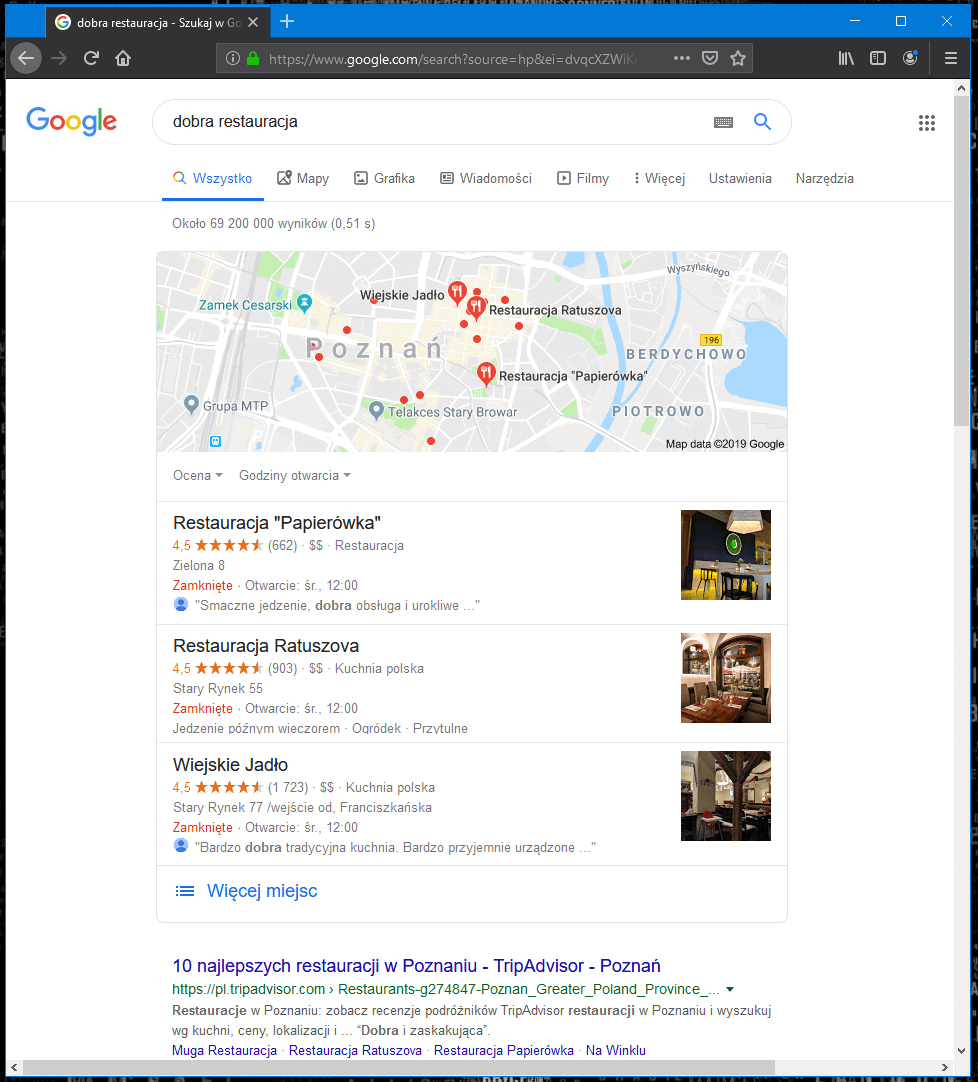 Podobny schemat dotyczy np. restauratorów. Jeśli ktoś szuka restauracji w Poznaniu- nie znajdzie stron niezoptymalizowanych. Jeśli ukryje swoją lokalizację- także trafi na strony zoptymalizowane- ale tylko pod Warszawę.
